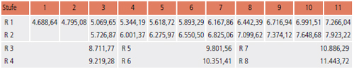 | R1 | 4.819,92 | 4.929,34 | 5.211,60 | 5.493,83 | 5.776,04 | 6.058,30 | 6.340,56 | 6.622,78 | 6.905,01 | 7.187,27 | 7.469,49 |
